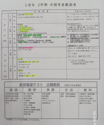2学期中間テスト範囲★発表