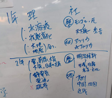 中2数 1-1~2-3 ※作図 1年5-7,8 ※問題集 1年基本問題 中2英 L1~L3pt1 中2理 1-7,9,10 中2地 10-13,15 中2歴 7-10